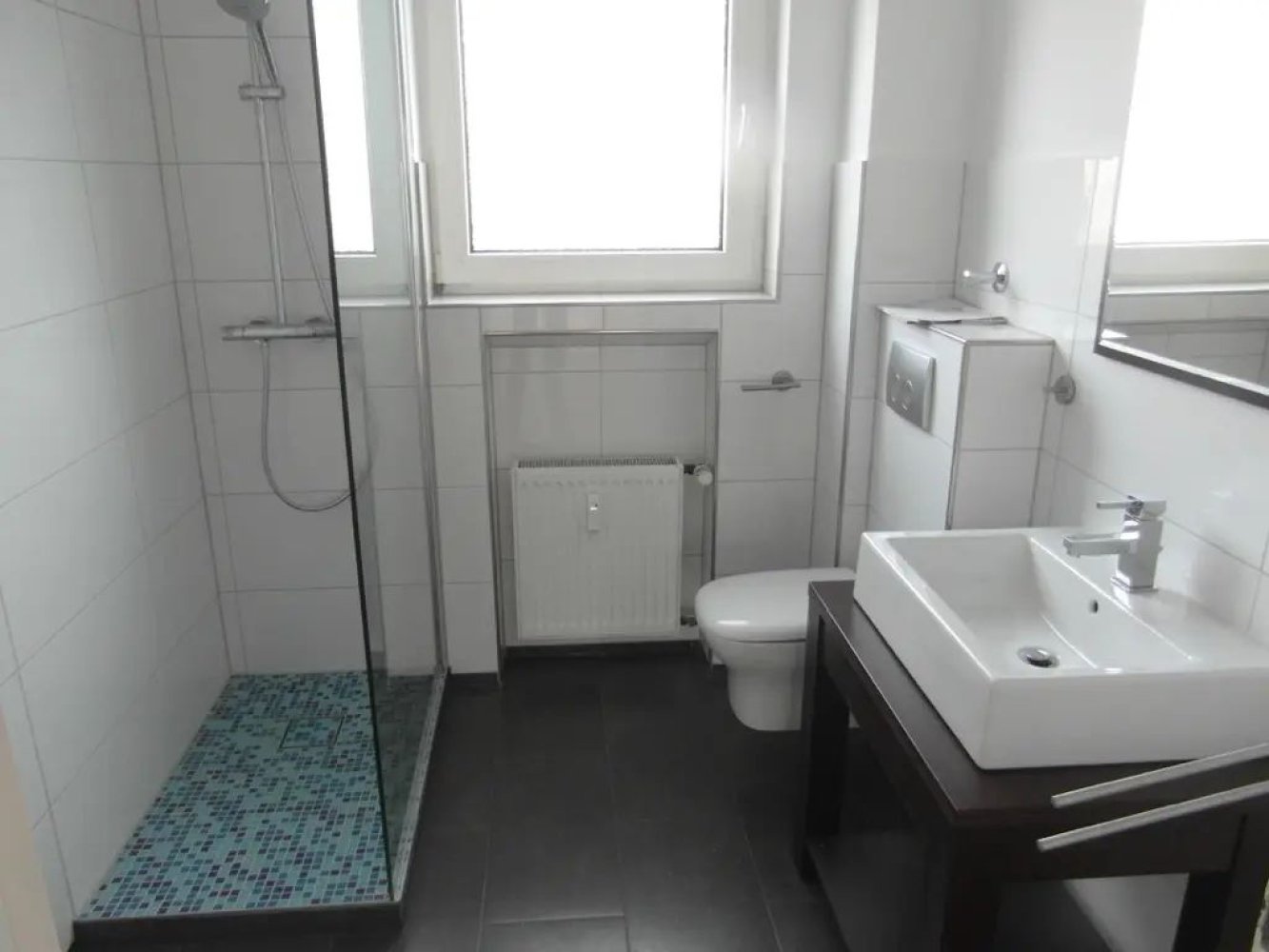 Das Dach stammt aus dem Baujahr, zeigt sich aber weiterhin funktional. Die Bäder verfügen über eine einfache, aber saubere Standardausstattung.